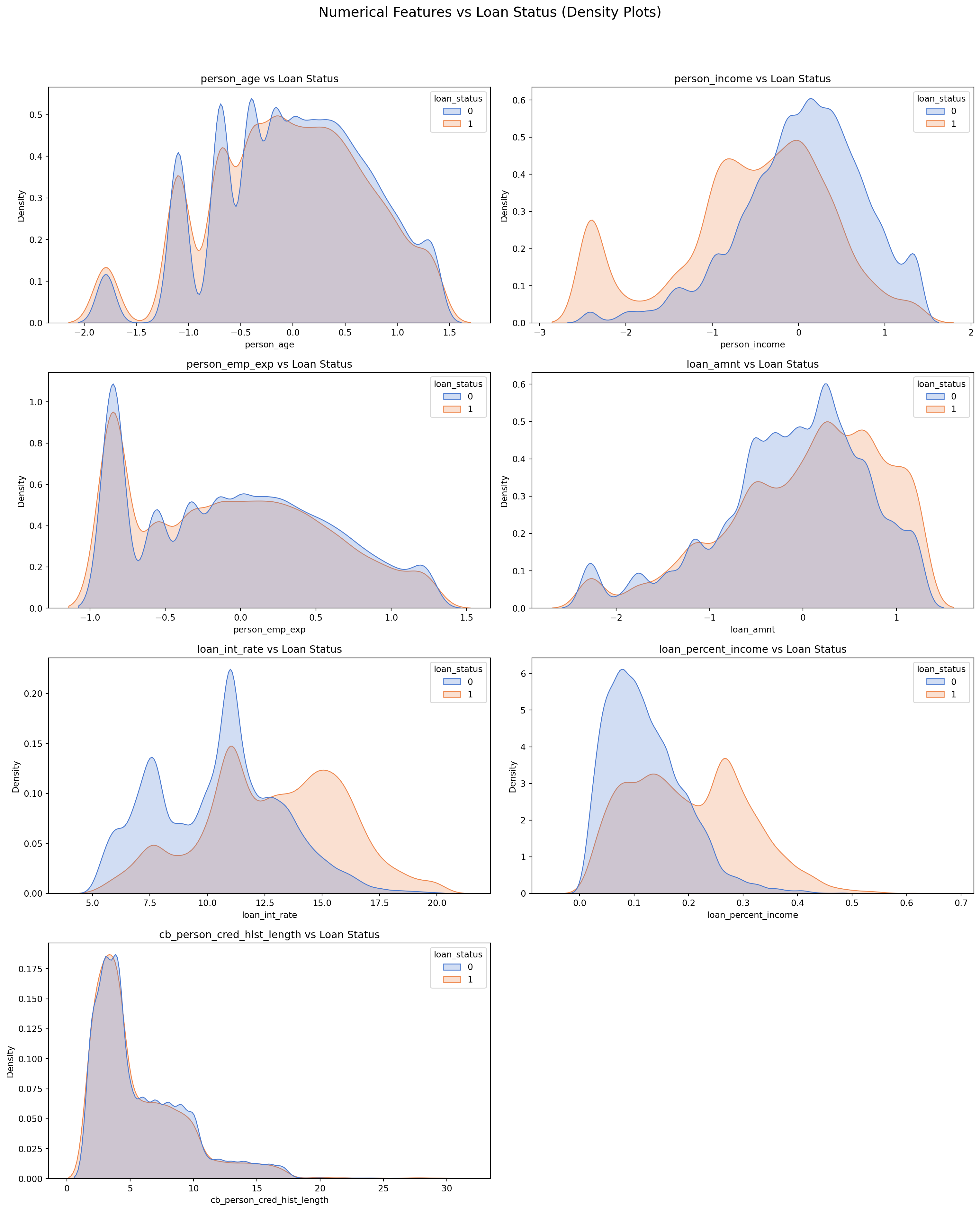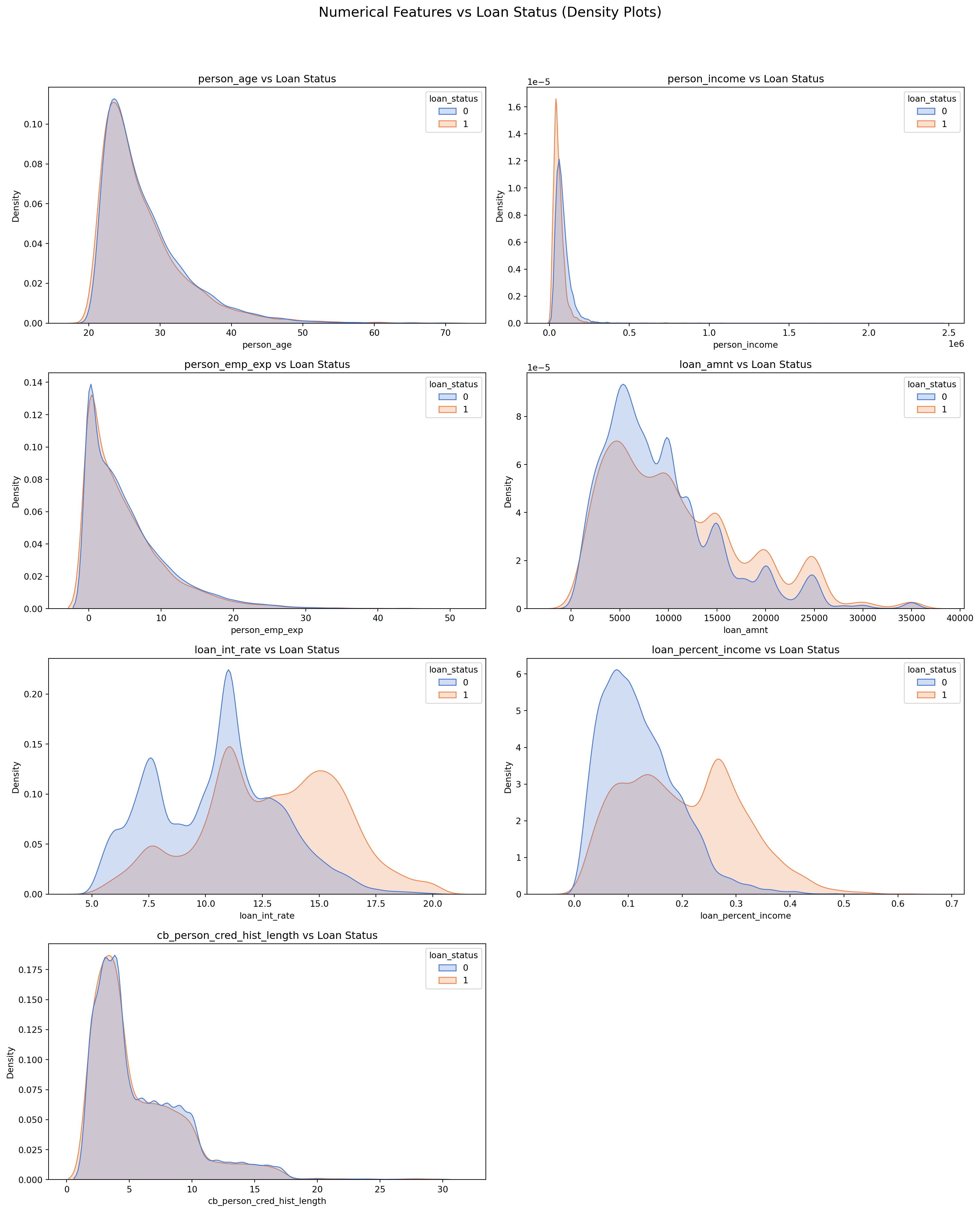# Sulani Ishara Accessed: 14th April 2025numerical_columns = ['person_age', 'person_income', 'person_emp_exp', 'loan_amnt', 'loan_int_rate', 'loan_percent_income', 'cb_person_cred_hist_length', 'credit_score']fig, axes = plt.subplots(4, 2, figsize=(16, 20))fig.suptitle('Numerical Features vs Loan Status (Density Plots)', fontsize=16)for i, col inenumerate(numerical_columns): sns.kdeplot(data=loans_df, x=col, hue='loan_status', ax=axes[i//2, i%2], fill=True, common_norm=False, palette='muted') axes[i//2, i%2].set_title(f'{col} vs Loan Status') axes[i//2, i%2].set_xlabel(col) axes[i//2, i%2].set_ylabel('Density')fig.delaxes(axes[3, 1])plt.tight_layout(rect=[0, 0, 1, 0.95])plt.show()