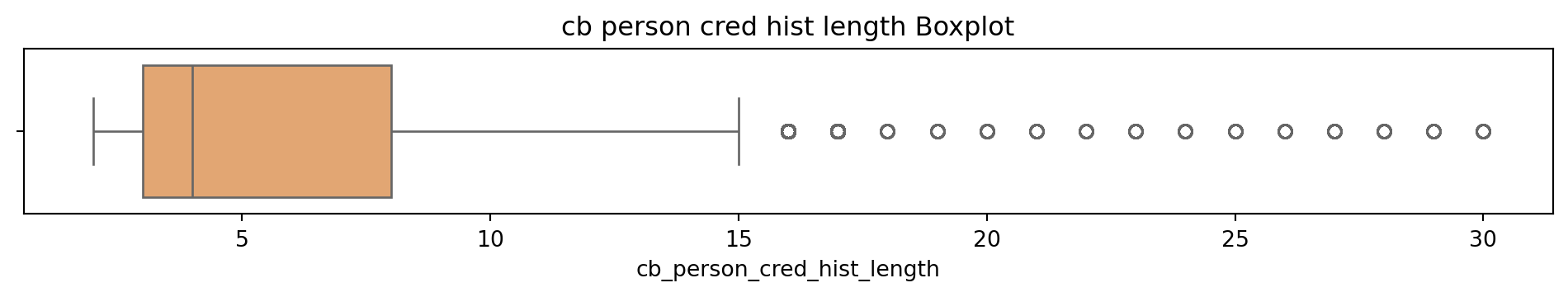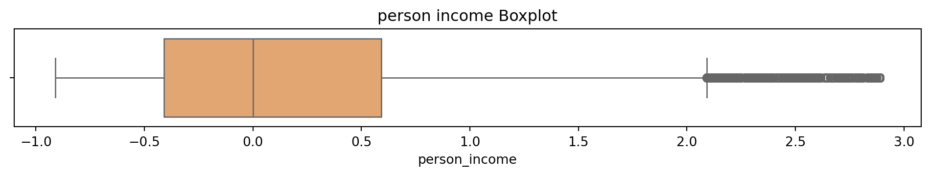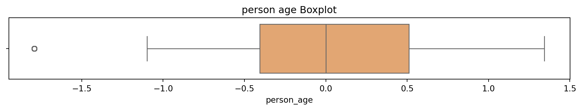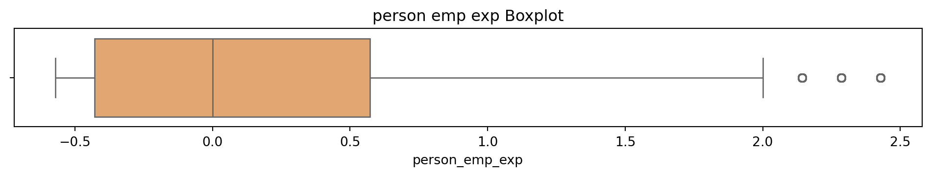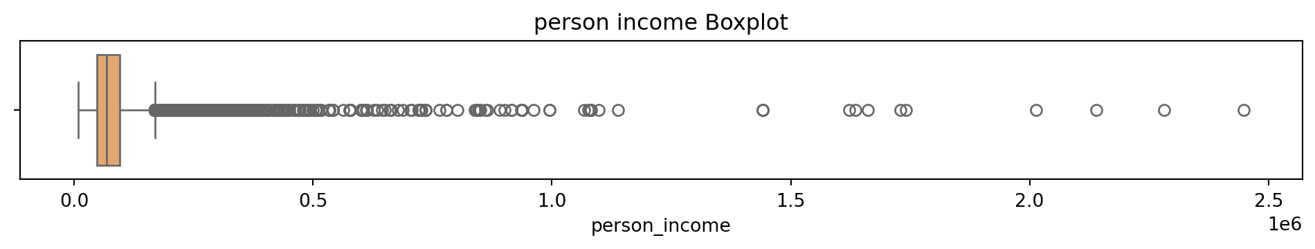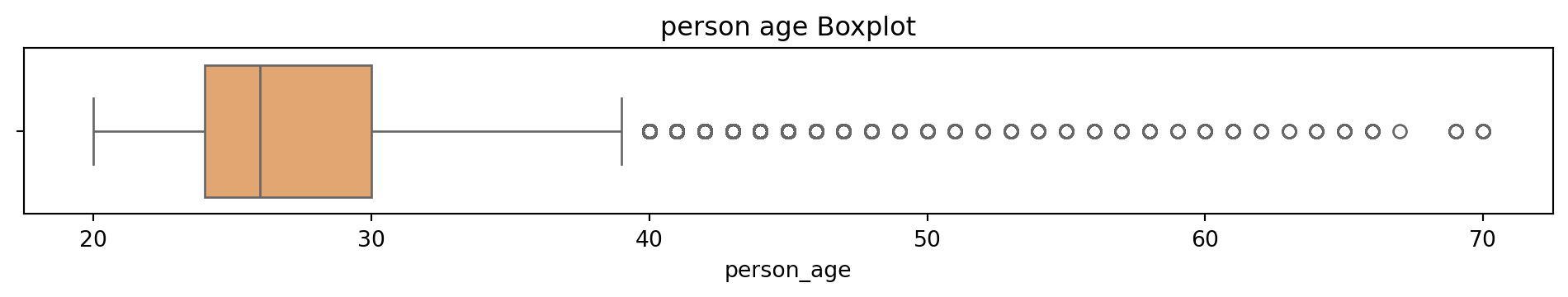 # Box and Whisker plot to see what the outliers in the dataset look like# Sulani Ishara Accessed: 14th April 2025# Function to perform univariate analysis for numeric columnsdef univariate_analysis(data, column, title): plt.figure(figsize=(10, 2)) sns.boxplot(x=data[column], color='sandybrown') plt.title(f'{title} Boxplot') plt.tight_layout() plt.show()print(f'\nSummary Statistics for {title}:\n', data[column].describe())columns_to_analyse = ['person_age', 'person_income', 'person_emp_exp', 'loan_amnt', 'loan_int_rate', 'loan_percent_income', 'cb_person_cred_hist_length', 'credit_score']for column in columns_to_analyse: univariate_analysis(loans_df, column, column.replace('_', ' '))