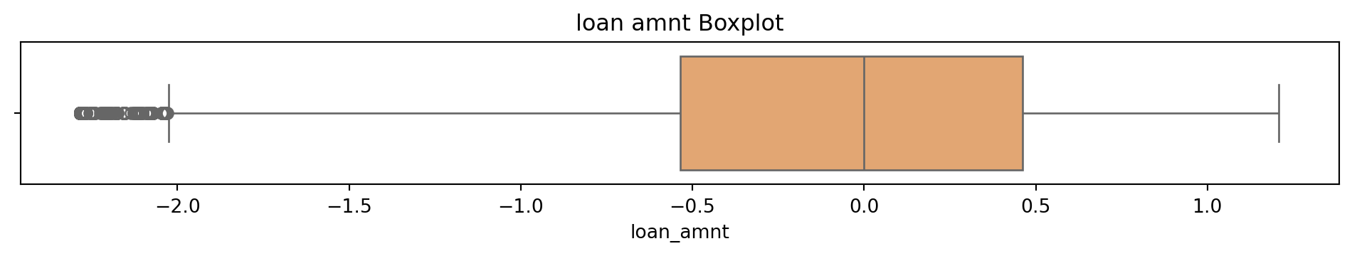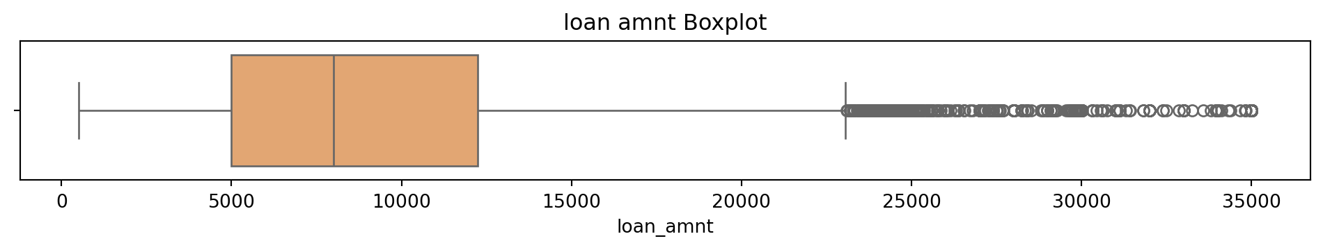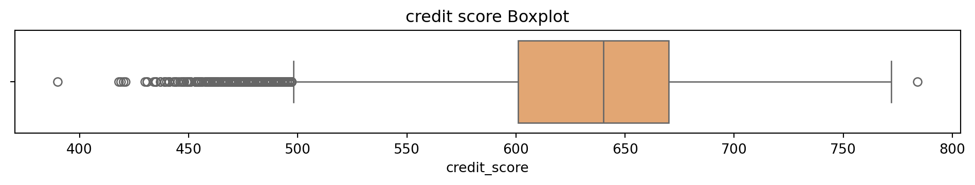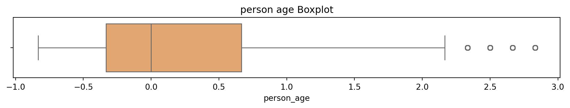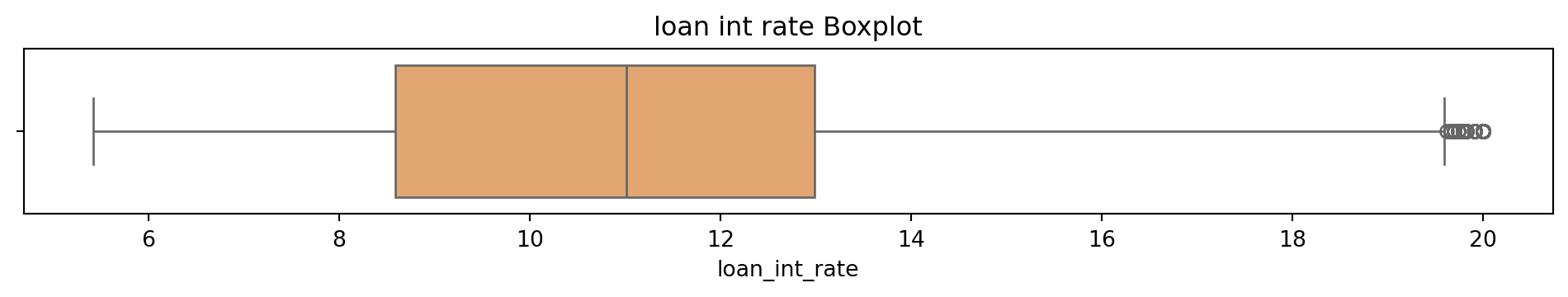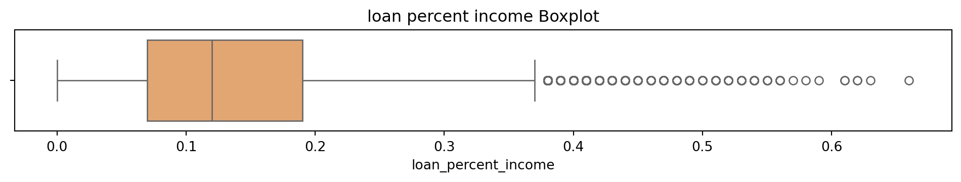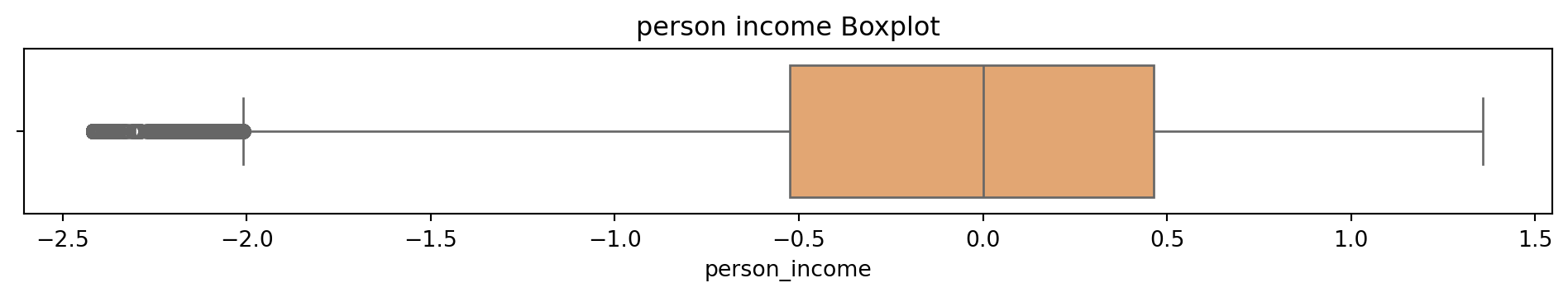 # Box and Whisker plot to see what the outliers in the dataset look like# Sulani Ishara Accessed: 14th April 2025# Function to perform univariate analysis for numeric columnsdef univariate_analysis(data, column, title): plt.figure(figsize=(10, 2)) sns.boxplot(x=data[column], color='sandybrown') plt.title(f'{title} Boxplot') plt.tight_layout() plt.show()print(f'\nSummary Statistics for {title}:\n', data[column].describe())columns_to_analyse = ['person_age', 'person_income', 'person_emp_exp', 'loan_amnt', 'loan_int_rate', 'loan_percent_income', 'cb_person_cred_hist_length', 'credit_score']for column in columns_to_analyse: univariate_analysis(loans_df, column, column.replace('_', ' '))