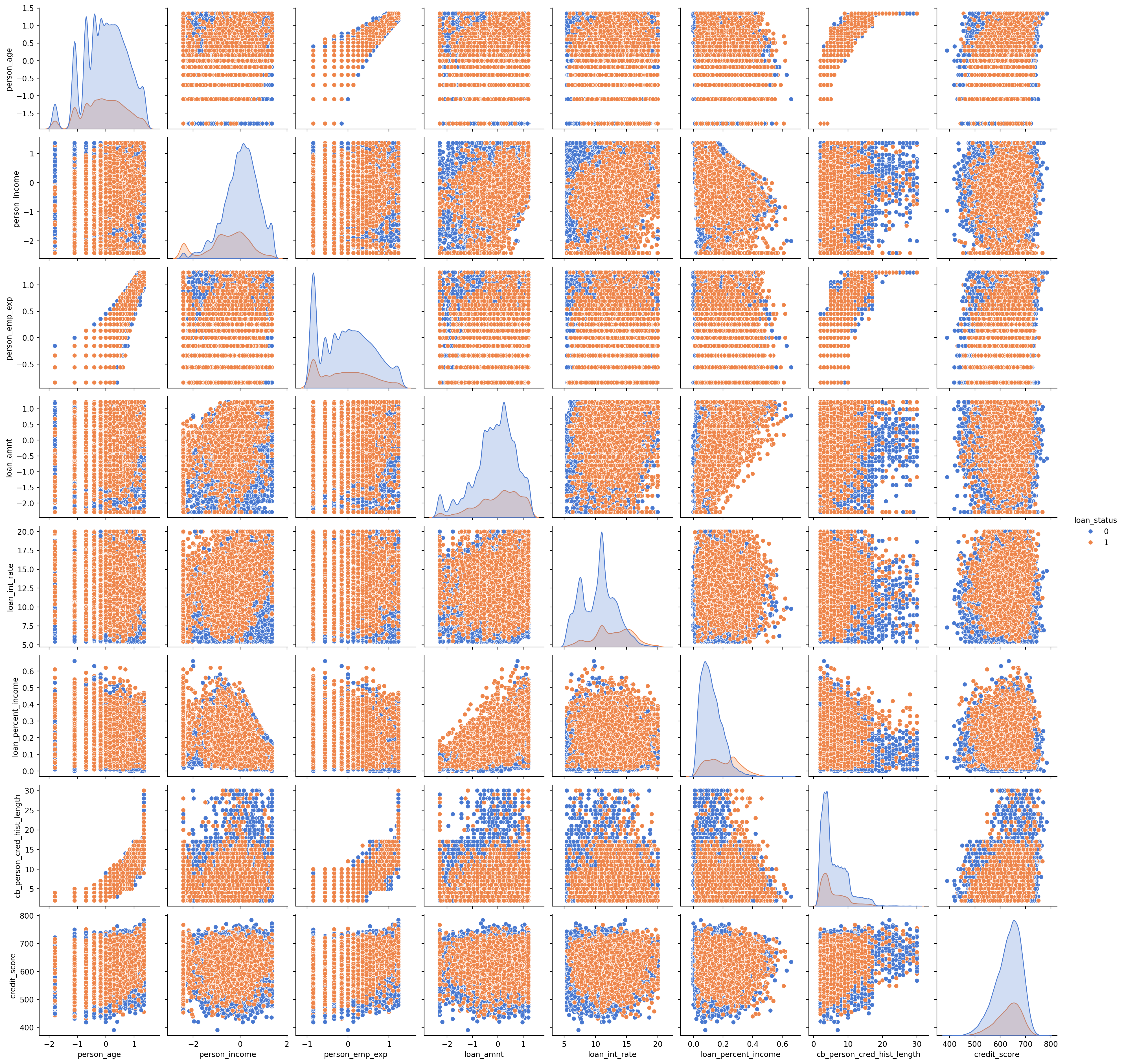 # Define numerical columns with targetnumerical_columns_with_target = ['person_age', 'person_income', 'person_emp_exp', 'loan_amnt', 'loan_int_rate', 'loan_percent_income', 'cb_person_cred_hist_length', 'credit_score']# Create pairplot of numerical features with loan_status as huesns.pairplot(loans_df[numerical_columns_with_target + ['loan_status']], hue='loan_status', palette='muted' )plt.show()