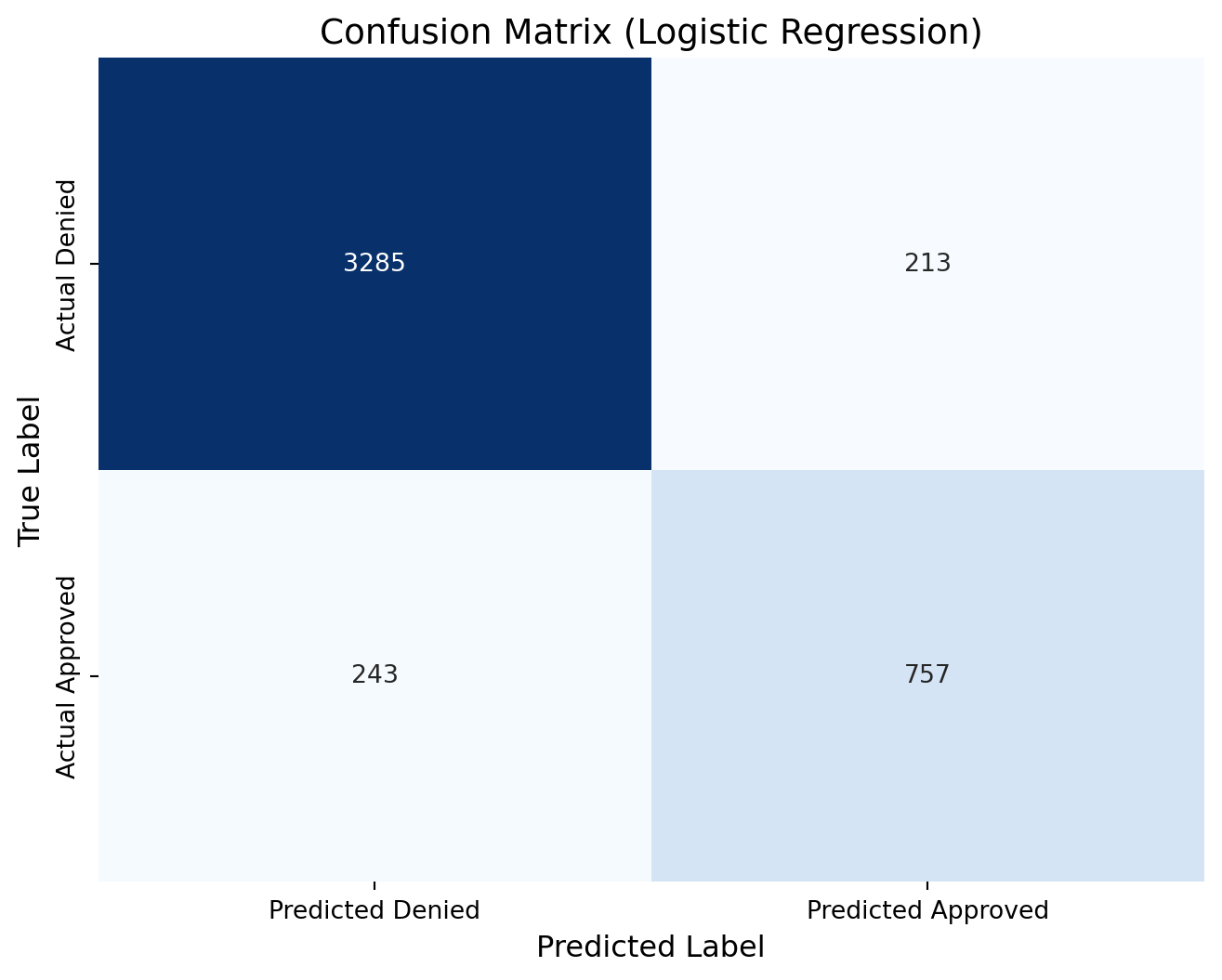lr_cm = confusion_matrix(y_test, predictions_lr )print(lr_cm)# Define new labels: index 0 -> "Denied", index 1 -> "Approved"labels = ['Denied', 'Approved']# Plot the confusion matrix heatmap with the renamed labelsplt.figure(figsize=(8, 6))sns.heatmap(lr_cm, annot=True, fmt="d", cmap="Blues", cbar=False, xticklabels=["Predicted Denied", "Predicted Approved"], yticklabels=["Actual Denied", "Actual Approved"])plt.xlabel("Predicted Label", fontsize=12)plt.ylabel("True Label", fontsize=12)plt.title("Confusion Matrix (Logistic Regression)", fontsize=14)plt.show()