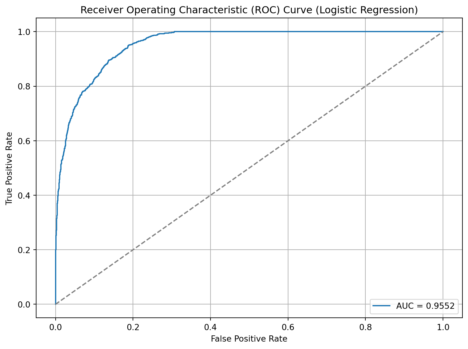 # From ChatGPT# Get false positive rate, true positive rate and thresholdsfpr, tpr, thresholds = roc_curve(y_test, lr_y_prob)# Plot the ROC curveplt.figure(figsize=(8, 6))plt.plot(fpr, tpr, label=f'AUC = {lr_auc_roc:.4f}')plt.plot([0, 1], [0, 1], linestyle='--', color='gray') # Diagonal line for random classifierplt.xlabel('False Positive Rate')plt.ylabel('True Positive Rate')plt.title('Receiver Operating Characteristic (ROC) Curve (Logistic Regression)')plt.legend(loc='lower right')plt.grid(True)plt.tight_layout()plt.show()