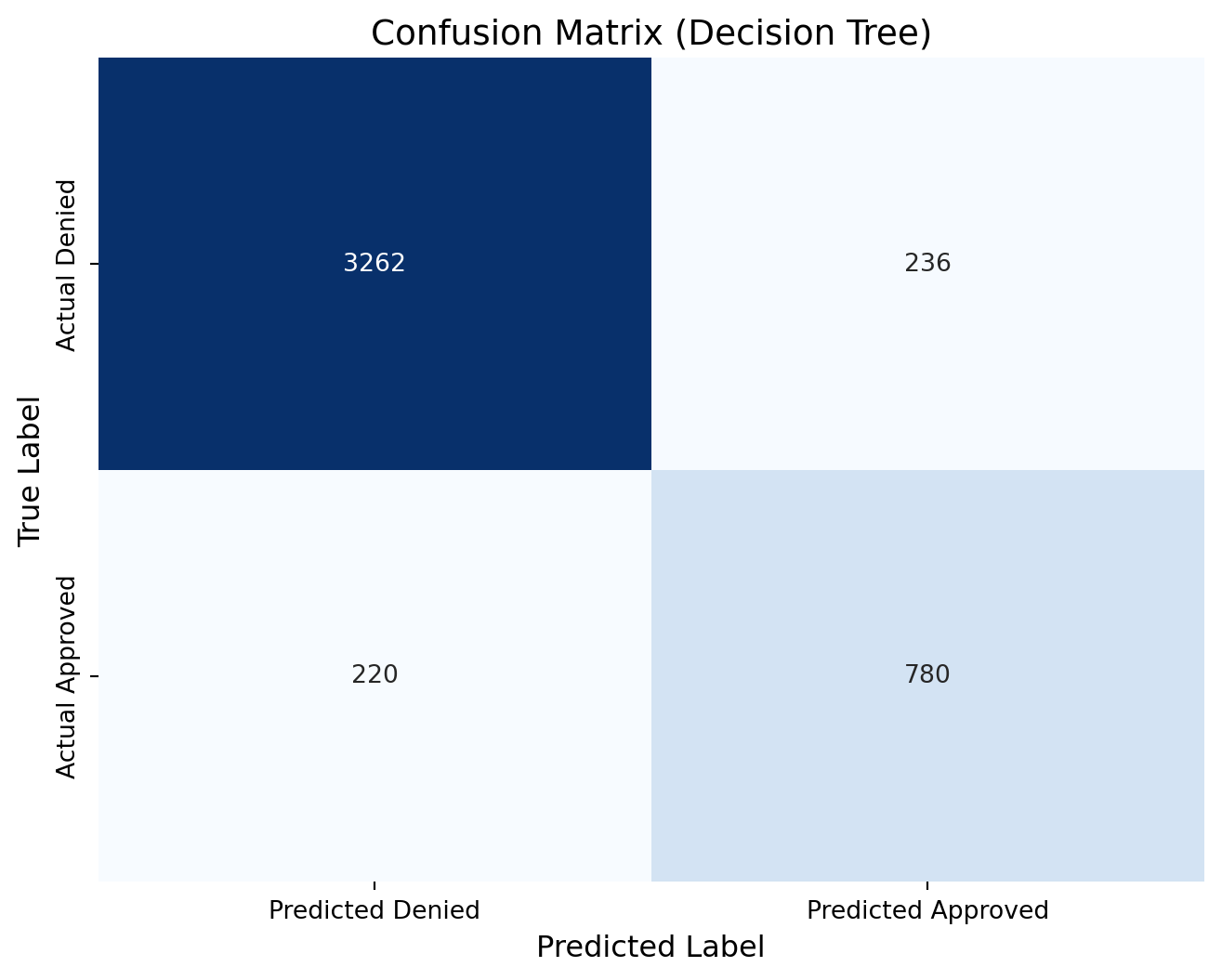 dt_cm = confusion_matrix(y_test, predictions_dt )print(dt_cm)# Define new labels: index 0 -> "Denied", index 1 -> "Approved"labels = ['Denied', 'Approved']# Plot the confusion matrix heatmap with the renamed labelsplt.figure(figsize=(8, 6))sns.heatmap(dt_cm, annot=True, fmt="d", cmap="Blues", cbar=False, xticklabels=["Predicted Denied", "Predicted Approved"], yticklabels=["Actual Denied", "Actual Approved"])plt.xlabel("Predicted Label", fontsize=12)plt.ylabel("True Label", fontsize=12)plt.title("Confusion Matrix (Decision Tree)", fontsize=14)plt.show()