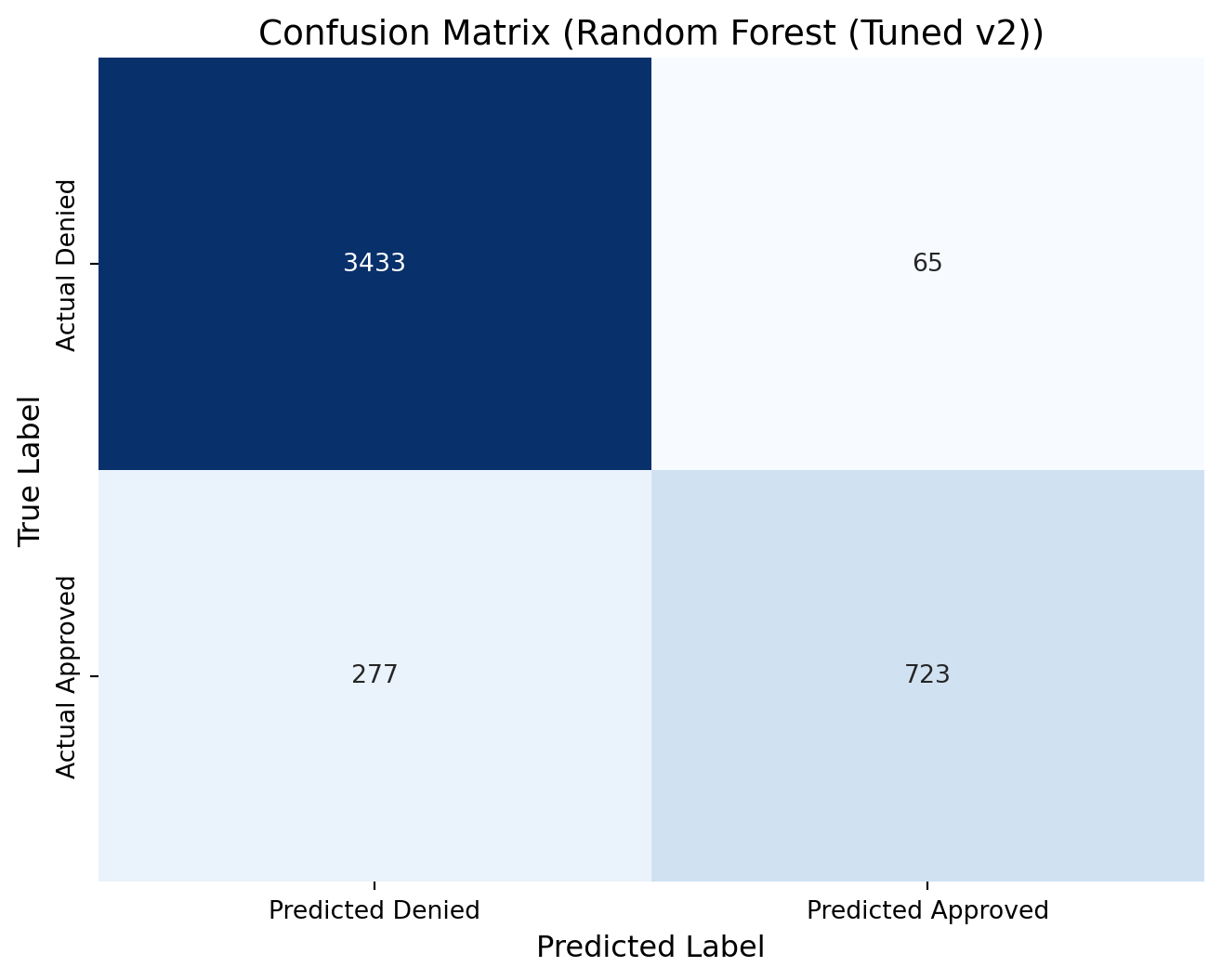 rf3_cm = confusion_matrix(y_test, predictions_rf2)print(rf3_cm)# Define new labels: index 0 -> "Denied", index 1 -> "Approved"labels = ['Denied', 'Approved']# Plot the confusion matrix heatmap with the renamed labelsplt.figure(figsize=(8, 6))sns.heatmap(rf3_cm, annot=True, fmt="d", cmap="Blues", cbar=False, xticklabels=["Predicted Denied", "Predicted Approved"], yticklabels=["Actual Denied", "Actual Approved"])plt.xlabel("Predicted Label", fontsize=12)plt.ylabel("True Label", fontsize=12)plt.title("Confusion Matrix (Random Forest (Tuned v2))", fontsize=14)plt.show()