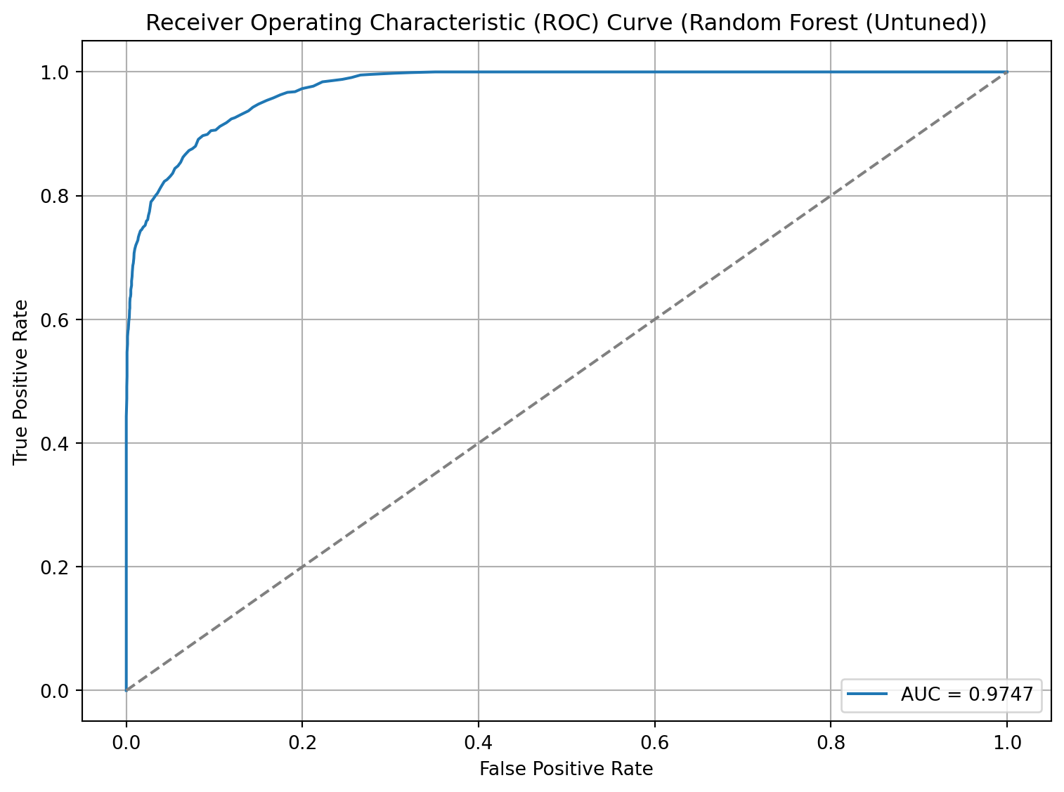 # From ChatGPT# Get false positive rate, true positive rate and thresholdsfpr, tpr, thresholds = roc_curve(y_test, rf_y_prob)# Plot the ROC curveplt.figure(figsize=(8, 6))plt.plot(fpr, tpr, label=f'AUC = {rf_auc_roc:.4f}')plt.plot([0, 1], [0, 1], linestyle='--', color='gray') # Diagonal line for random classifierplt.xlabel('False Positive Rate')plt.ylabel('True Positive Rate')plt.title('Receiver Operating Characteristic (ROC) Curve (Random Forest (Untuned))')plt.legend(loc='lower right')plt.grid(True)plt.tight_layout()plt.show()