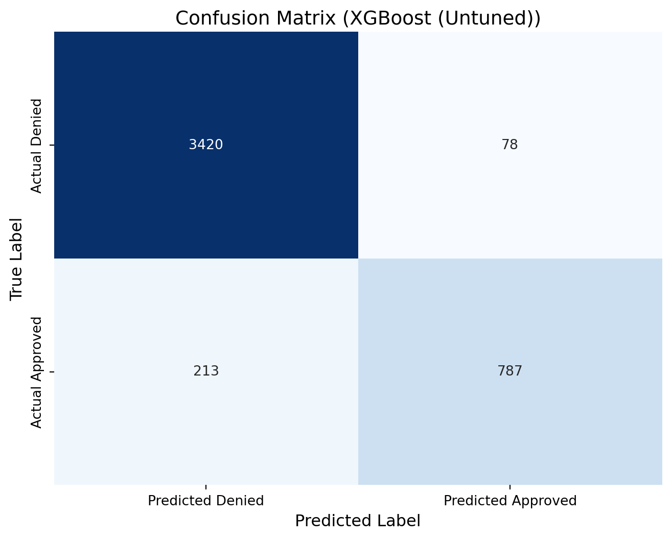 xgb_cm = confusion_matrix(y_test, predictions_xgb)print(xgb_cm)# Define new labels: index 0 -> "Denied", index 1 -> "Approved"labels = ['Denied', 'Approved']# Plot the confusion matrix heatmap with the renamed labelsplt.figure(figsize=(8, 6))sns.heatmap(xgb_cm, annot=True, fmt="d", cmap="Blues", cbar=False, xticklabels=["Predicted Denied", "Predicted Approved"], yticklabels=["Actual Denied", "Actual Approved"])plt.xlabel("Predicted Label", fontsize=12)plt.ylabel("True Label", fontsize=12)plt.title("Confusion Matrix (XGBoost (Untuned))", fontsize=14)plt.show()