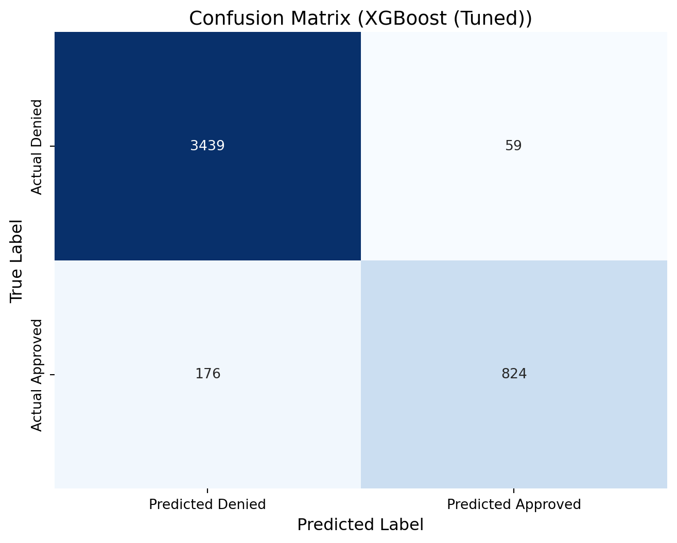 xgb2_cm = confusion_matrix(y_test, predictions_xgb2)print(xgb2_cm)# Define new labels: index 0 -> "Denied", index 1 -> "Approved"labels = ['Denied', 'Approved']# Plot the confusion matrix heatmap with the renamed labelsplt.figure(figsize=(8, 6))sns.heatmap(xgb2_cm, annot=True, fmt="d", cmap="Blues", cbar=False, xticklabels=["Predicted Denied", "Predicted Approved"], yticklabels=["Actual Denied", "Actual Approved"])plt.xlabel("Predicted Label", fontsize=12)plt.ylabel("True Label", fontsize=12)plt.title("Confusion Matrix (XGBoost (Tuned))", fontsize=14)plt.show()