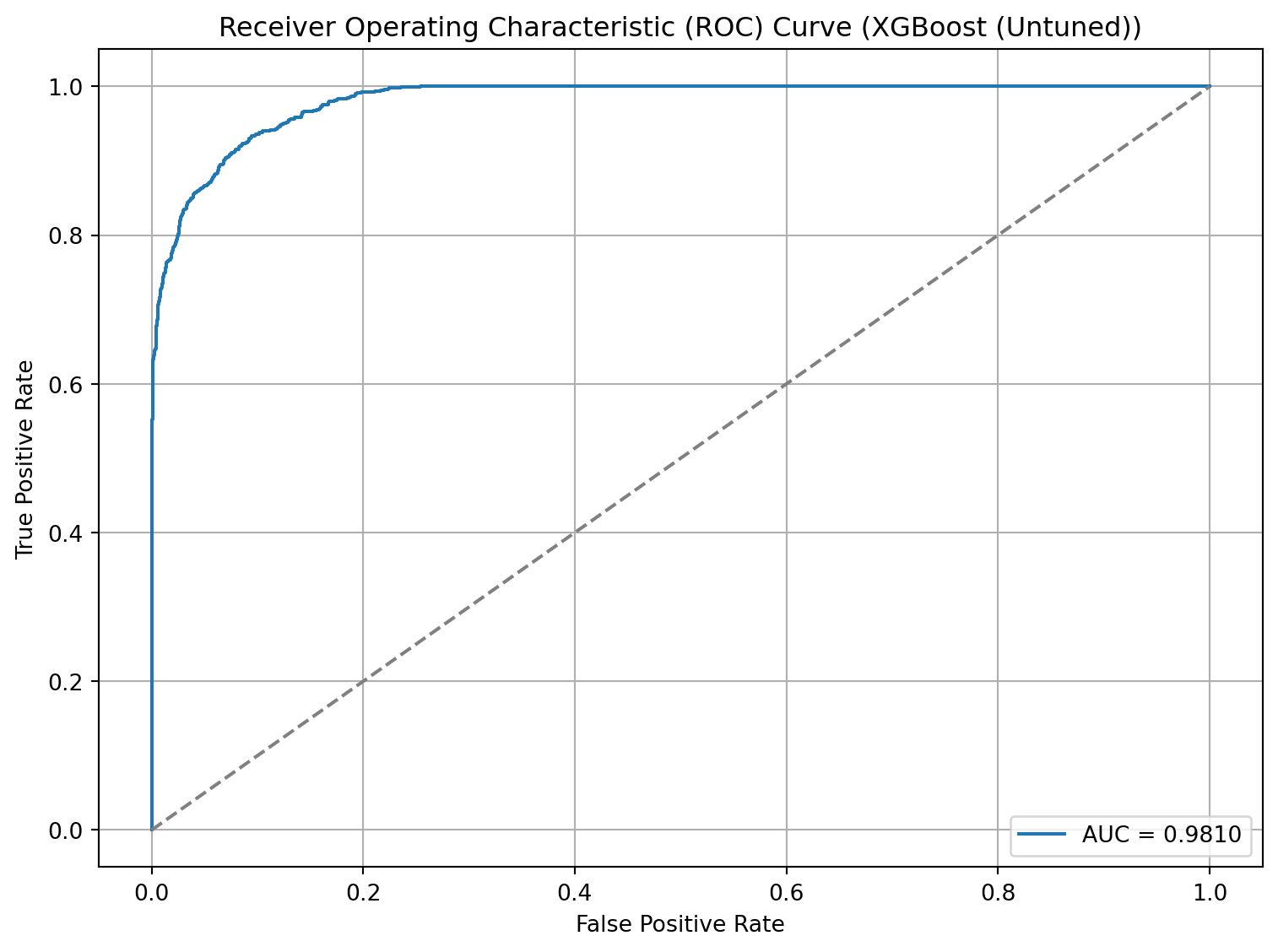 # From ChatGPT# Get false positive rate, true positive rate and thresholdsfpr, tpr, thresholds = roc_curve(y_test, xgb_y_prob)# Plot the ROC curveplt.figure(figsize=(8, 6))plt.plot(fpr, tpr, label=f'AUC = {xgb_auc_roc:.4f}')plt.plot([0, 1], [0, 1], linestyle='--', color='gray') # Diagonal line for random classifierplt.xlabel('False Positive Rate')plt.ylabel('True Positive Rate')plt.title('Receiver Operating Characteristic (ROC) Curve (XGBoost (Untuned))')plt.legend(loc='lower right')plt.grid(True)plt.tight_layout()plt.show()