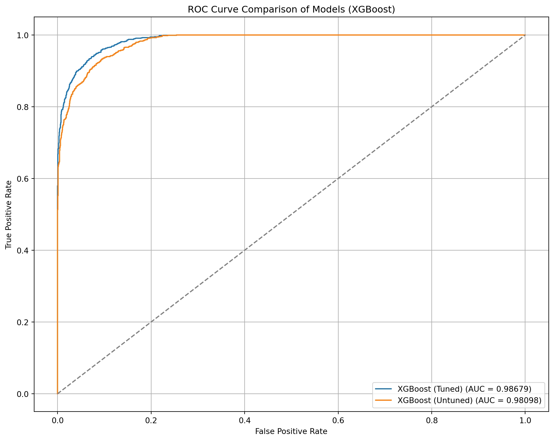 # Dictionary of model names and predicted probabilitiesmodels_probs = {"XGBoost (Tuned)": xgb2_y_prob,"XGBoost (Untuned)": xgb_y_prob,}plt.figure(figsize=(10, 8))# Plot each ROC curvefor name, probs in models_probs.items(): fpr, tpr, _ = roc_curve(y_test, probs) roc_auc = auc(fpr, tpr) plt.plot(fpr, tpr, label=f'{name} (AUC = {roc_auc:.5f})')# Plot random guess lineplt.plot([0, 1], [0, 1], linestyle='--', color='gray')plt.xlabel('False Positive Rate')plt.ylabel('True Positive Rate')plt.title('ROC Curve Comparison of Models (XGBoost)')plt.legend(loc='lower right')plt.grid(True)plt.tight_layout()plt.show()