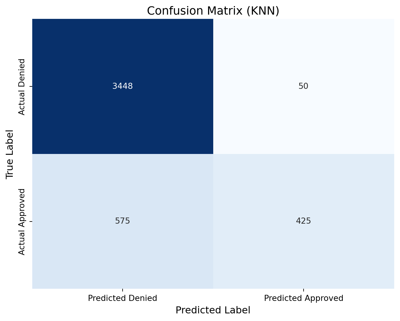 knn_cm = confusion_matrix(y_test, predictions_knn)print(knn_cm)# Define new labels: index 0 -> "Denied", index 1 -> "Approved"labels = ['Denied', 'Approved']# Plot the confusion matrix heatmap with the renamed labelsplt.figure(figsize=(8, 6))sns.heatmap(knn_cm, annot=True, fmt="d", cmap="Blues", cbar=False, xticklabels=["Predicted Denied", "Predicted Approved"], yticklabels=["Actual Denied", "Actual Approved"])plt.xlabel("Predicted Label", fontsize=12)plt.ylabel("True Label", fontsize=12)plt.title("Confusion Matrix (KNN)", fontsize=14)plt.show()