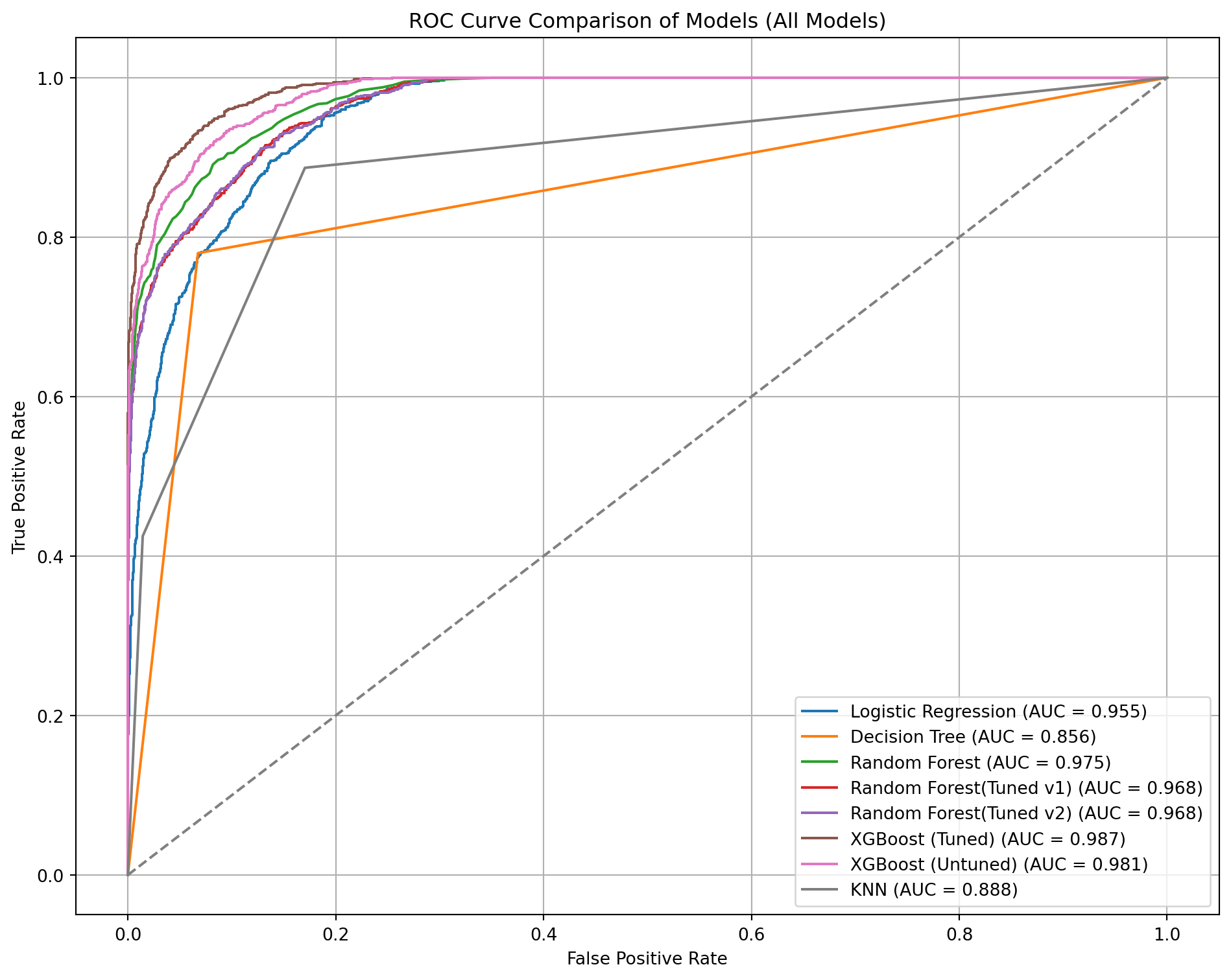 # Dictionary of model names and predicted probabilitiesmodels_probs = {"Random Forest(Untuned)": rf_y_prob,"Random Forest(Tuned v1)": rf2_y_prob,"Random Forest(Tuned v2)": rf3_y_prob}plt.figure(figsize=(10, 8))# Plot each ROC curvefor name, probs in models_probs.items(): fpr, tpr, _ = roc_curve(y_test, probs) roc_auc = auc(fpr, tpr) plt.plot(fpr, tpr, label=f'{name} (AUC = {roc_auc:.5f})')# Plot random guess lineplt.plot([0, 1], [0, 1], linestyle='--', color='gray')plt.xlabel('False Positive Rate')plt.ylabel('True Positive Rate')plt.title('ROC Curve Comparison of Models (Random Forest)')plt.legend(loc='lower right')plt.grid(True)plt.tight_layout()plt.show()